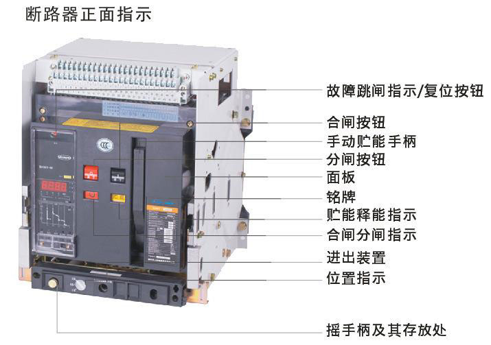 3、組成一個(gè)抽出式框架式斷路器主要有:斷路器本體,移動(dòng)部分,固定部分,脫扣單元,附件組成。