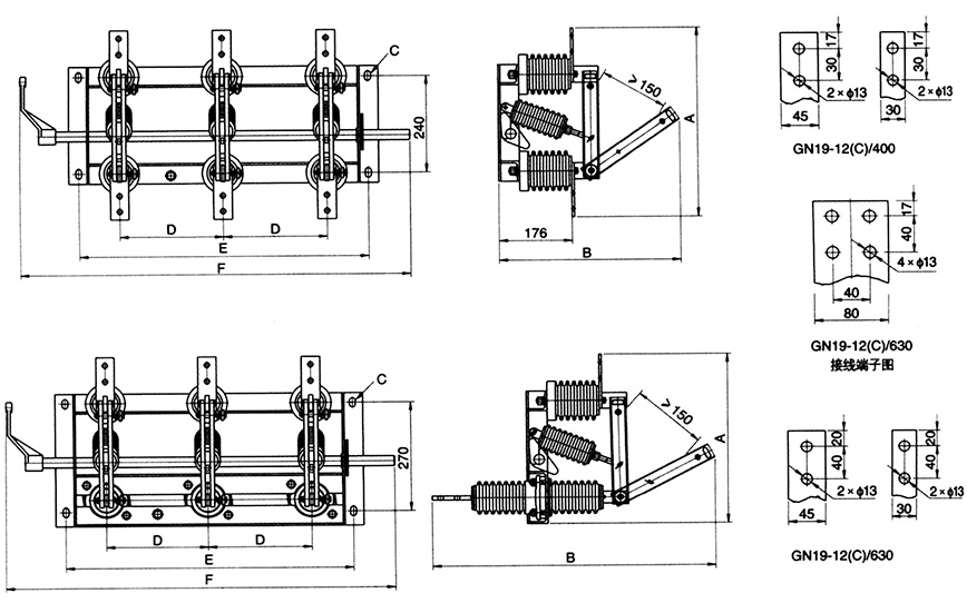本隔離開關(guān)為三極型,由底架、轉(zhuǎn)軸、及杠桿、瓷支柱絕緣子、閘刀及接線板等部分組成。轉(zhuǎn)軸安置在底架上,其上焊有三對(duì)杠桿,杠桿通過拉桿瓷絕緣子與閘刀相連。轉(zhuǎn)軸伸出底架,其任何一段均可與操作機(jī)構(gòu)相連。