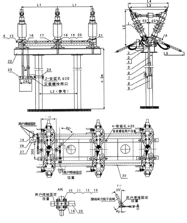 6、根據(jù)用戶的方便,操動機(jī)構(gòu)可以安裝在任一極的下方,操動效果一樣。