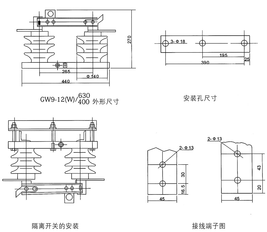 GW9型戶外高壓隔離開(kāi)關(guān)為交流50Hz的戶外高壓電器設(shè)備,額定電壓等級(jí)有10kV,15kV,24kV供高壓線路在無(wú)負(fù)載情況下進(jìn)行開(kāi)合,以及對(duì)被檢修高壓母線、斷路器等電氣設(shè)備帶電的高壓線路進(jìn)行電氣隔離之用,也可用于開(kāi)、合小的電容或電感電流。